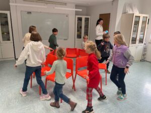 Še zadnji dan novoletnih počitniških delavnic se počasi izteka. Ker so bile temperature danes prenizke, smo ostali na toplem in se zabavali, barvali, igrali smo se zanimivo igro na izpadanje s stoli, nato pa si pogledali še lep risani film in zraven uživali ob kokicah.