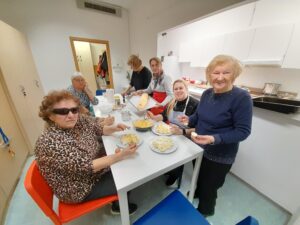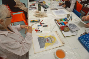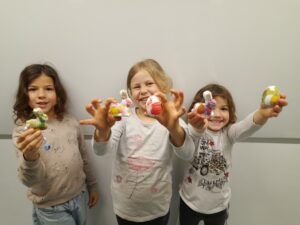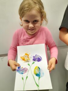 Na ustvarjalni delavnici 7. 4. 2026 so otroci ustvarjali pomladne cvetlice z enostavno, a zanimivo tehniko: serviete so obrisali s flomastri in nato to barvo zmočili z mokrim čopičem, da se je nežno razlila. Cvetove smo s plastelinom prilepili na bel list papirja in rožicam narisali še peclje in liste.