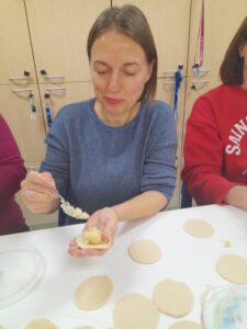 16. 12. 2025 smo imeli zelo zanimivo delavnico ukrainkse kuhinje, na kateri nas je kuharska mojstrica Natalia učila pripravljati ukrainske varenike z mesom, krompirjem in višnjami. Vse tri vrste varenikov so bile zelo okusne.