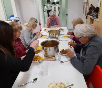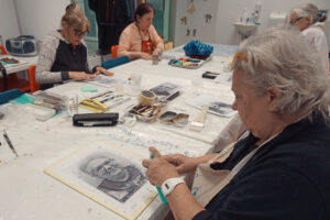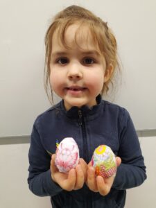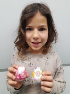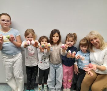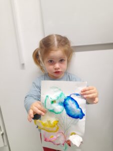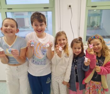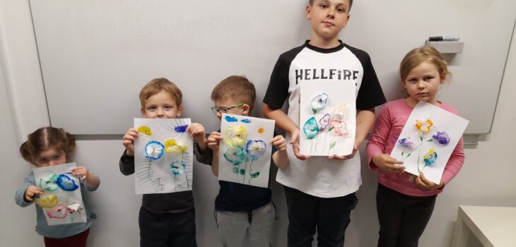 Na ustvarjalni delavnici 7. 4. 2026 so otroci ustvarjali pomladne cvetlice z enostavno, a zanimivo tehniko: serviete so obrisali s flomastri in nato to barvo zmočili z mokrim čopičem, da se je nežno razlila. Cvetove smo s plastelinom prilepili na bel list papirja in rožicam narisali še peclje in liste.