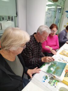 Tudi naše odrasle umetnice v različnih likovnih delavnicah vsak teden pridno ustvarjajo. Takole so slikale 5. 12. 2025, pod budnim očesom mentorja Ljuba Parovela.