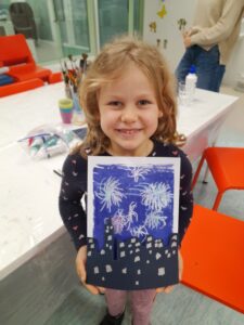Na likovni delavnici za otroke, 5. 12. 2025, smo v mešani tehniki, z uporabo kartona, voščenk in akrilnih barv ustvarjali mesto ponoči in ognjemet