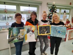 Letos imamo neverjetno plodovito ustvarjalno leto, saj imamo kar 4 različne likovne skupine za odrasle ter likovno in ustvarjalno delavnico za otroke ter delavnico kvačkanja za otroke. Tele čudovite izdelke so na zadnjem srečanju, 10. 12. 2025, ustvarjale umetnice skupine ARTiha, ki pod mentorstvom Tatjane Haber z akrilnimi barvami ustvarja vsako sredo od 9. ure dalje. Če ste umetniška duša, se nam pridružite tudi vi!