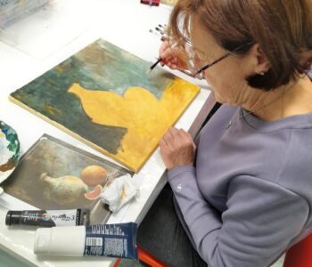 Tudi naše odrasle umetnice v različnih likovnih delavnicah vsak teden pridno ustvarjajo. Takole so slikale 5. 12. 2025, pod budnim očesom mentorja Ljuba Parovela.