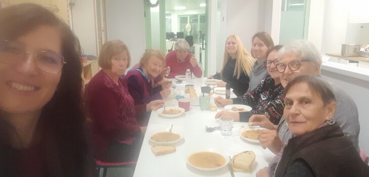 Na kuharski delavnici 4. 12. 2025 smo skuhali aromatično enolončnico z rdečo lečo, zeleno, papriko, paradižnikom, klobaso, čebulo in česnom, za posladek pa smo spekli še palačinke z marmelado in čokolado. Vse je bilo zelo okusno in v prijetnem vzdušju smo se veselo družili.