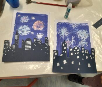 Na likovni delavnici za otroke, 5. 12. 2025, smo v mešani tehniki, z uporabo kartona, voščenk in akrilnih barv ustvarjali mesto ponoči in ognjemet
