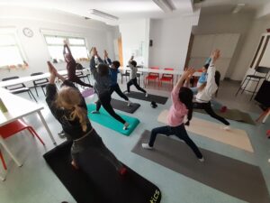 Na tretjem dnevu zimskih počitniških delavnic 18. 2. 2026 sta nas že zjutraj obiskali psička in njena vodnica iz Tačk pomagačk. Po malici smo se odpravili na igrišče, popoldan pa smo se razgibavali na jogi za otroke in slikali na likovni delavnici.