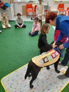 Na tretjem dnevu zimskih počitniških delavnic 18. 2. 2026 sta nas že zjutraj obiskali psička in njena vodnica iz Tačk pomagačk. Po malici smo se odpravili na igrišče, popoldan pa smo se razgibavali na jogi za otroke in slikali na likovni delavnici.