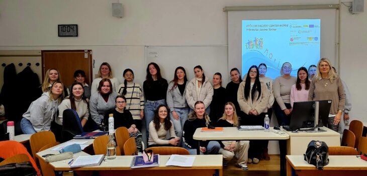 13. 1. 2026 – Že vrsto let z velikim uspehom sodelujemo s Pedagoško fakulteto v Kopru. Tudi tokrat smo predstavili delovanje našega centra ter številne priložnosti za vključevanje študentk – kot prostovoljk, udeleženk ali v okviru opravljanja obvezne pedagoške prakse. Sodelovanje prinaša obojestranske koristi: naš center bogatijo zagnane in motivirane študentke, same pa pri nas pridobivajo dragocene praktične izkušnje, nova znanja in spretnosti, krepijo svojo samozavest ter si ustvarjajo trdne temelje za uspešno nadaljnjo karierno pot. Za uspešno sodelovanje se zahvaljujemo prof. Maji Mezgec! UP PEF – Univerza na Primorskem, Pedagoška fakulteta